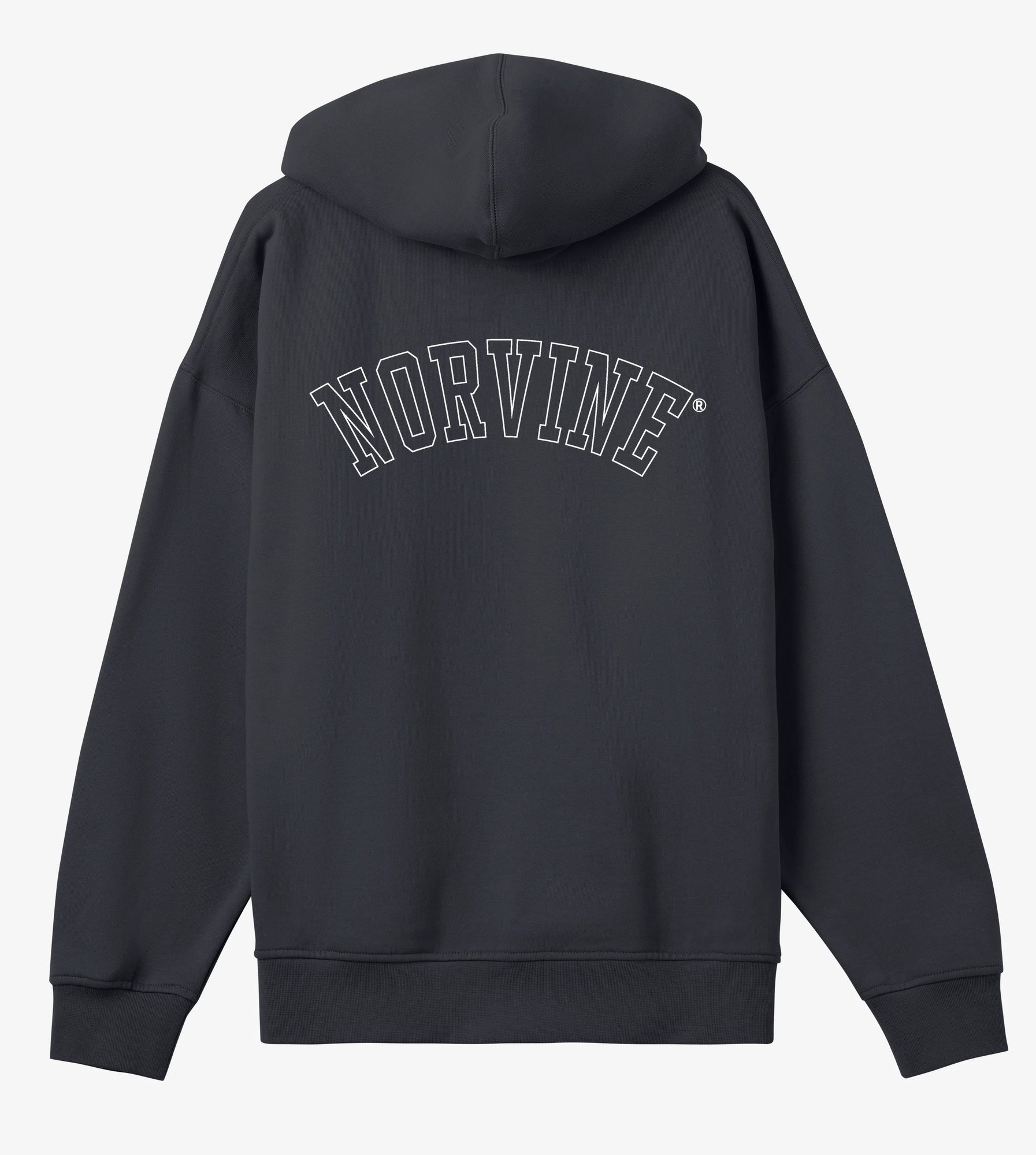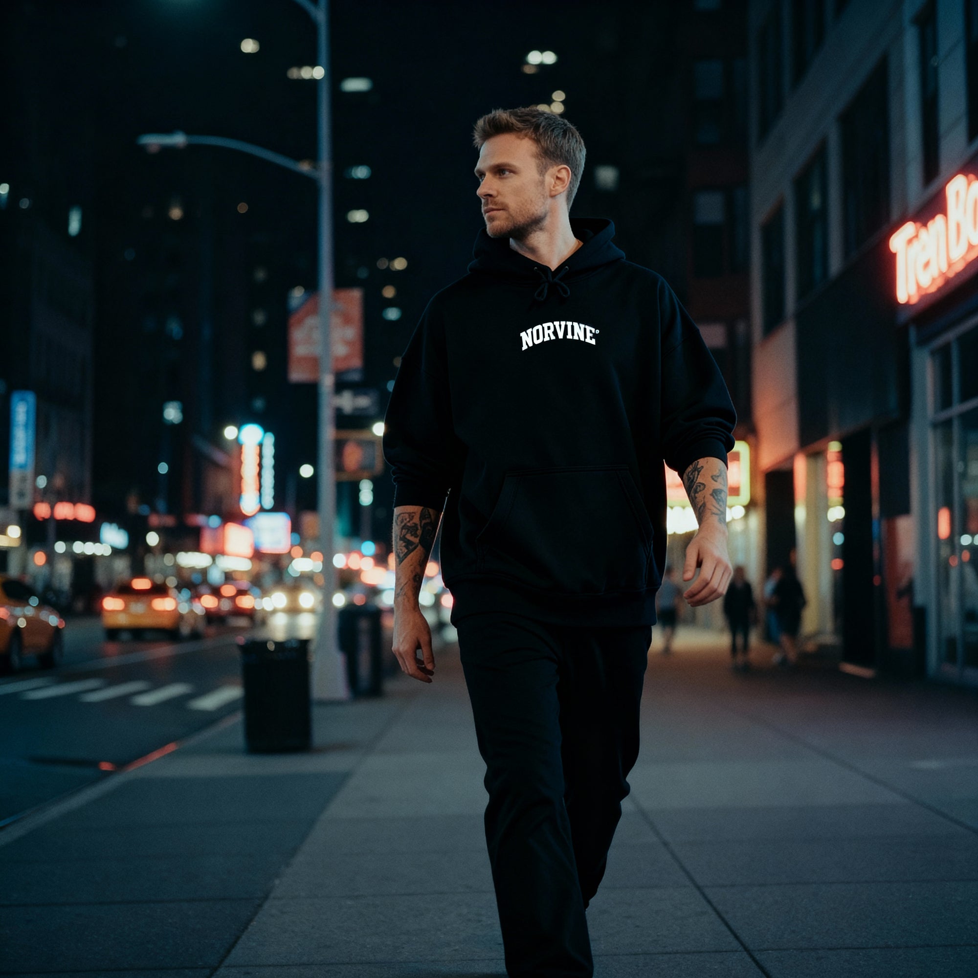 Felpa boxy con cappuccio da uomo Norvine. Realizzata in felpa garzata pesante (370 g/m²), 83% cotone biologico e 17% poliestere riciclato. Vestibilità oversize con spalle scese, ampi polsini e orlo a coste, cuciture spalla ribattute con nastro collo, cappuccio doppio con cordini, tasca a marsupio con cucitura piatta e dettaglio half moon all’interno del collo.